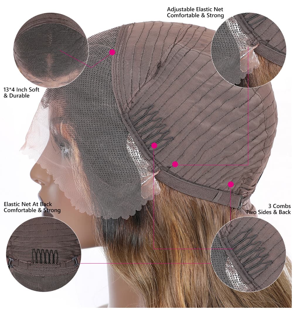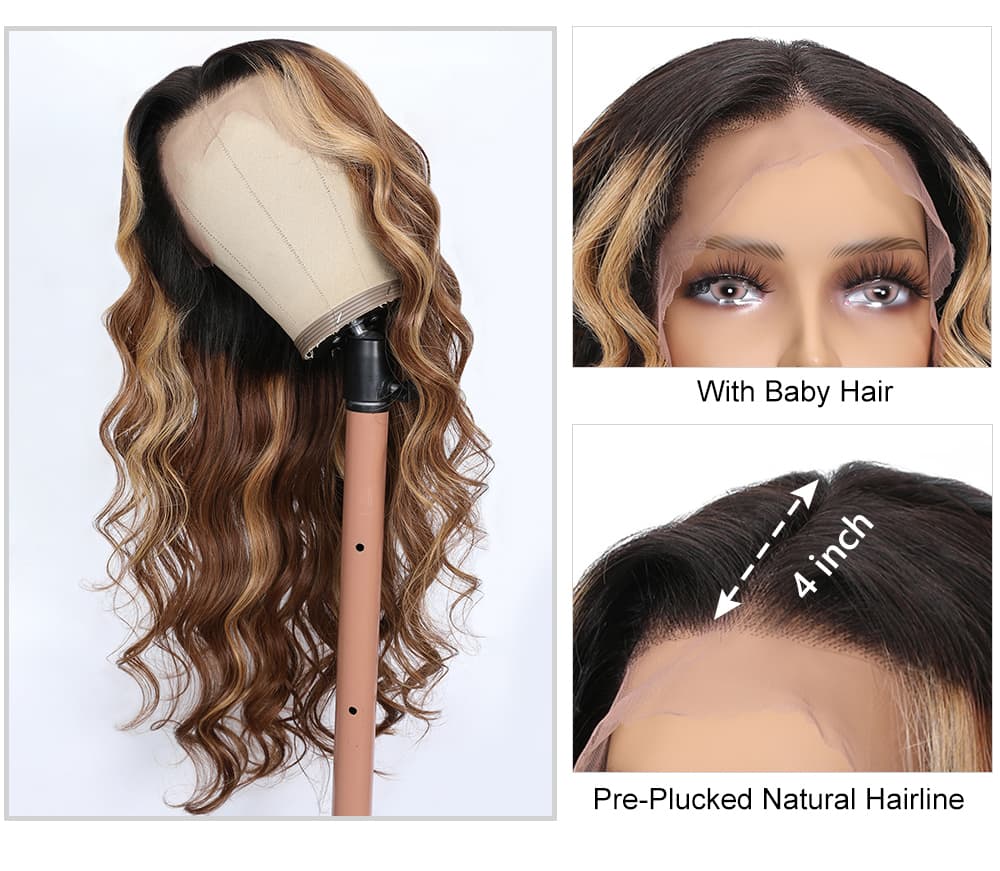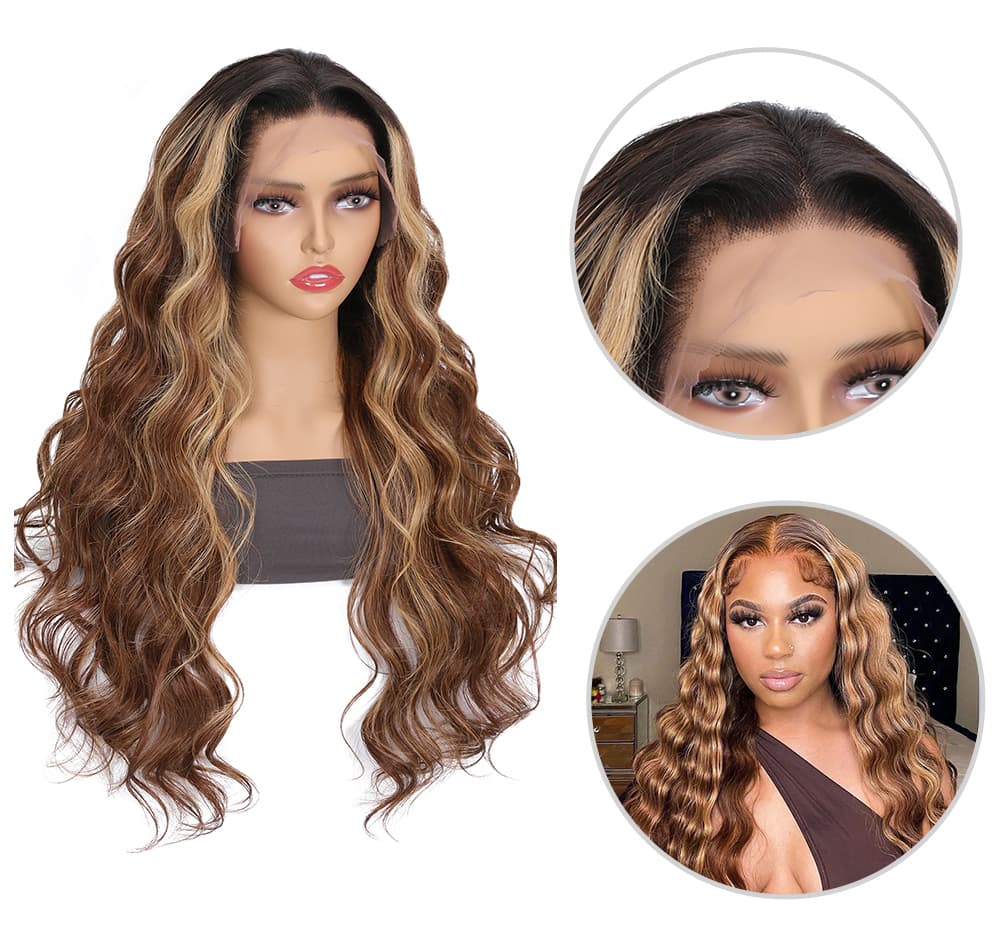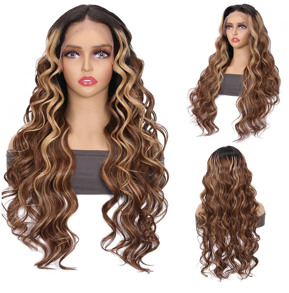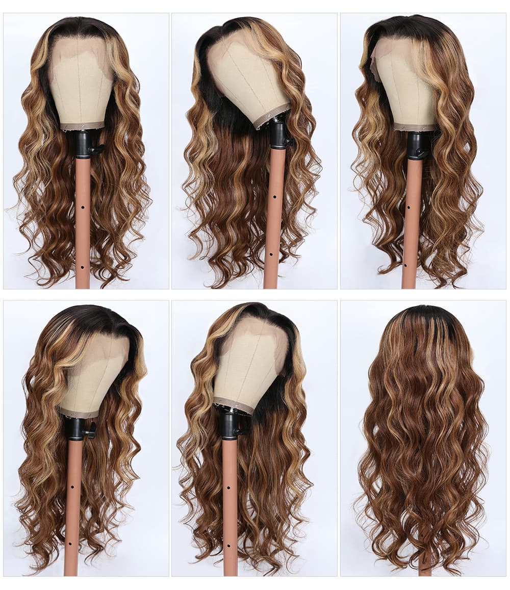 Incolorwig Chunky Brown With Blonde Highlights Lace Frontal Wigs 150% Density Eversion Type Loose Wave Wigs