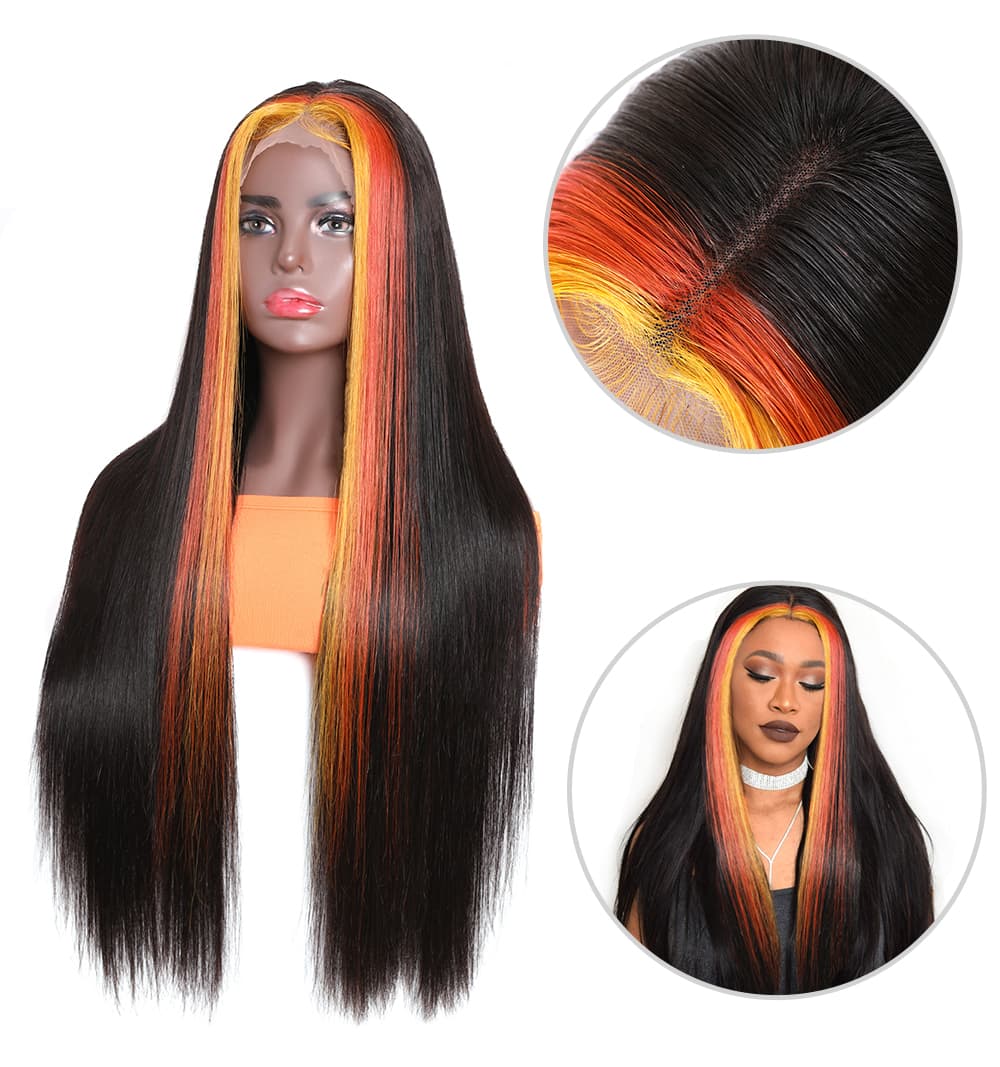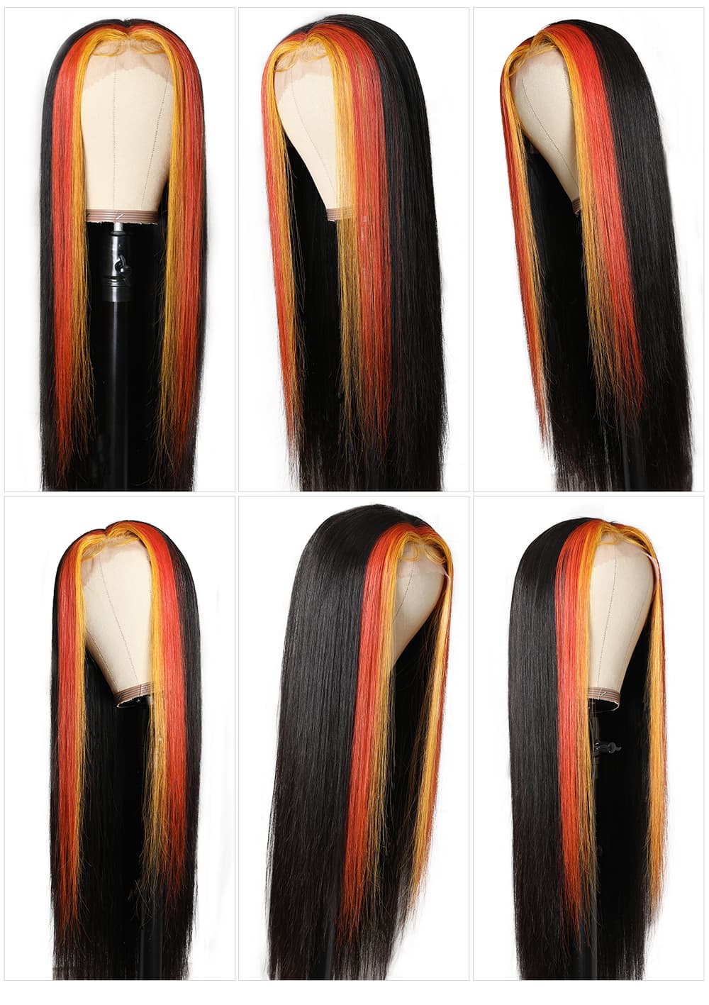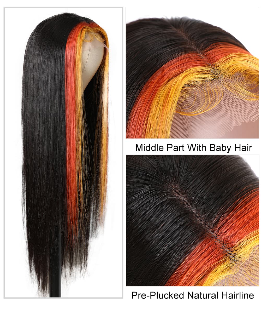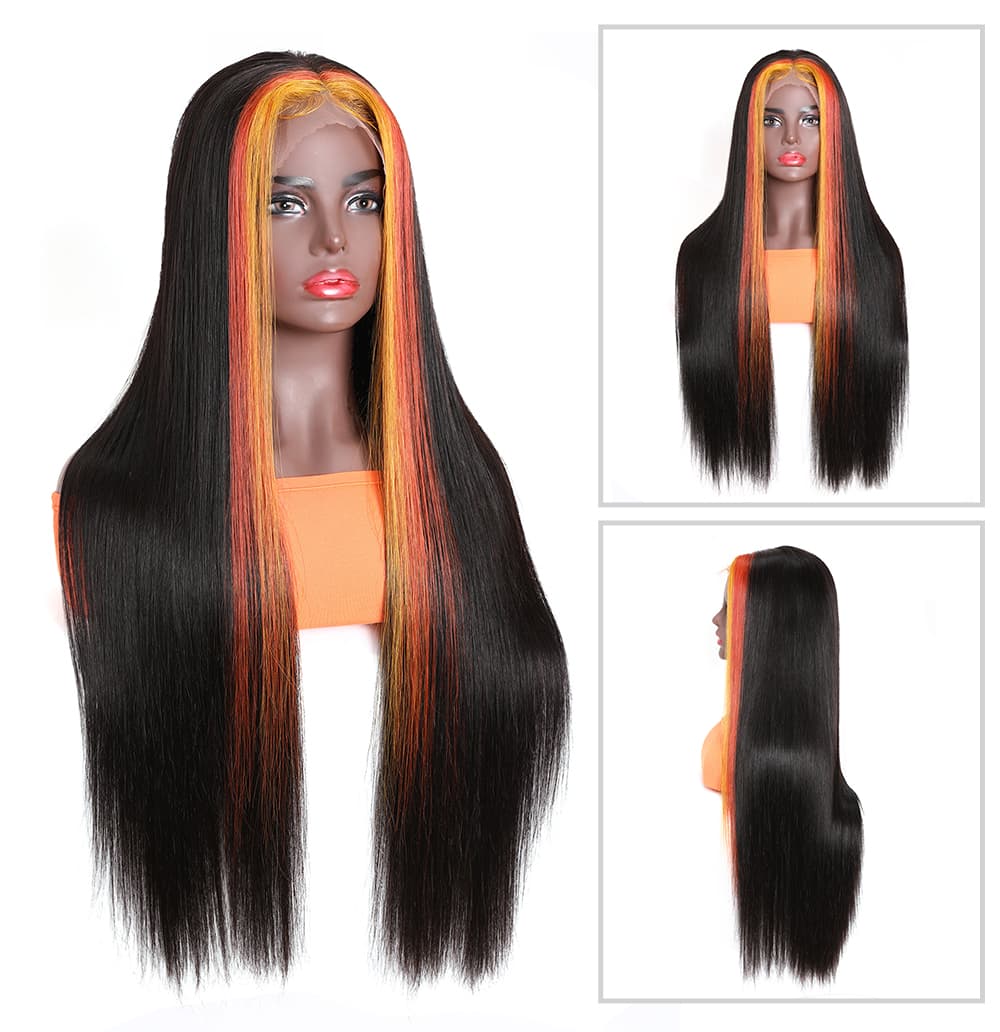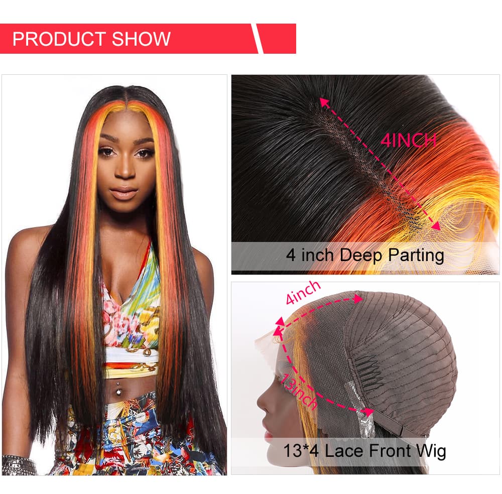 Incolorwig High Quality 13*4 Lace Frontal Wig Natural Black Mixed Orange And Yellow Straight Human Hair Highlight Wig Pre-plucked Natural Hairline With Baby Hair