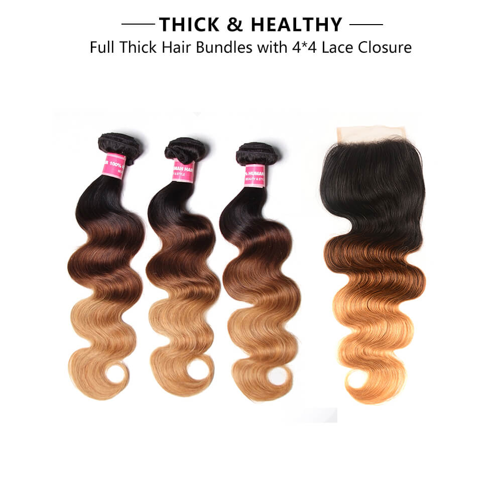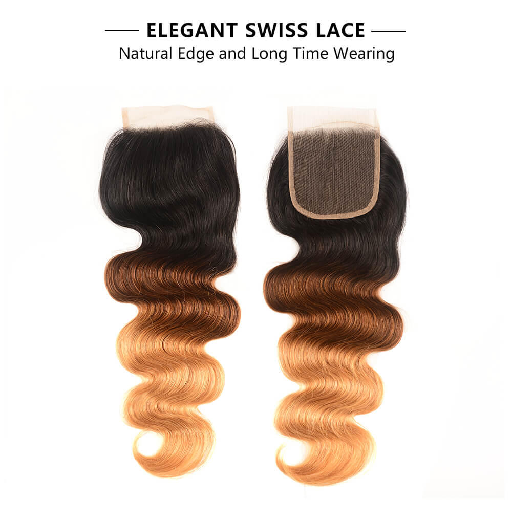 Incolorwig Brazilian Virgin Hair, 3 Bundles Hair With 4*4 Free Part Lace Closure, #T1B427 Ombre Color & Body Wave Texture For Women