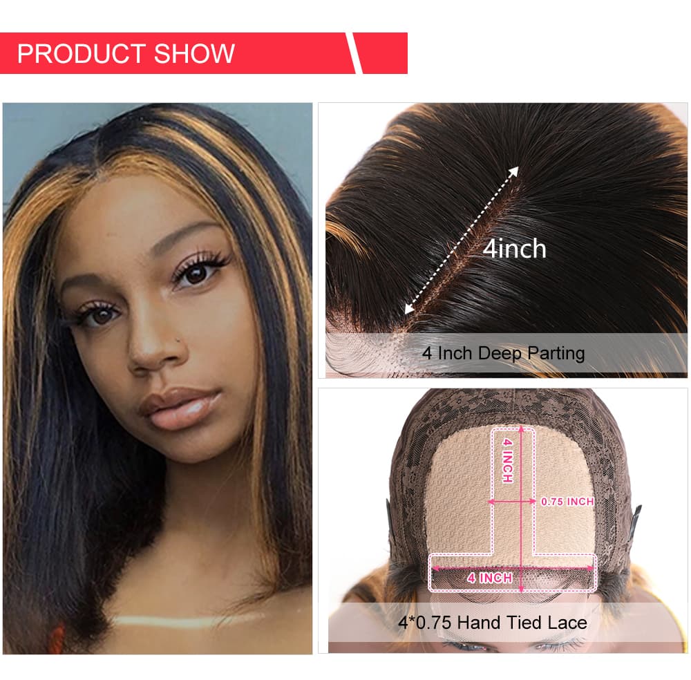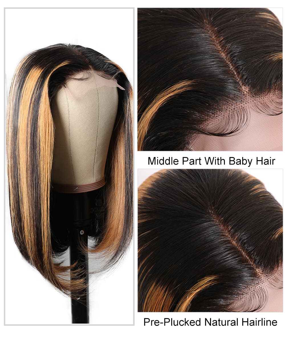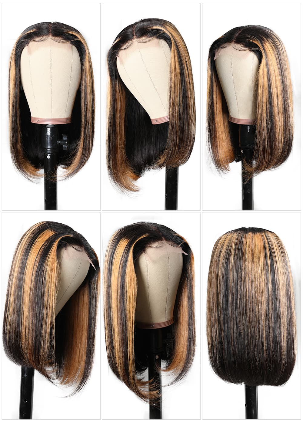 Incolorwig Affordable Highlight Ombre #TP1B30 Colored Straight Short Bob Wigs 4*0.75 Lace Part Wigs 150% Density Middle Part Natural Hairline Best Human Hair Wigs