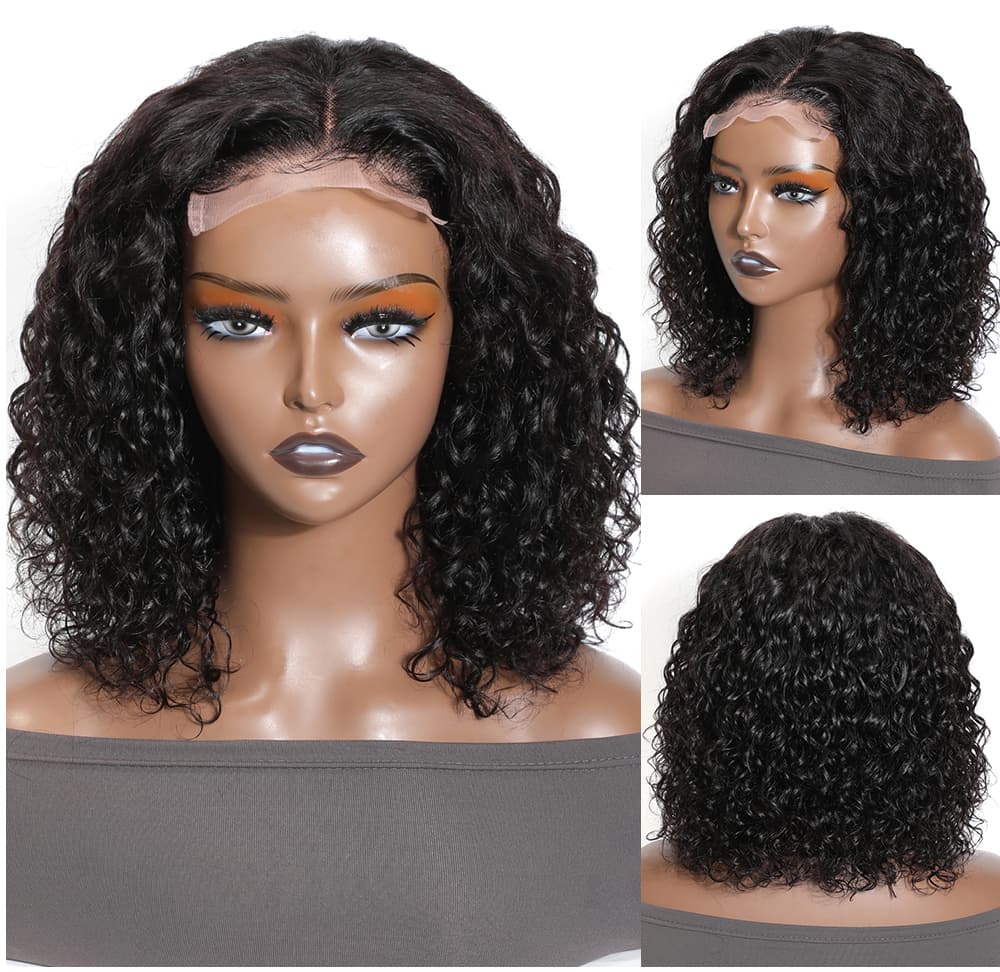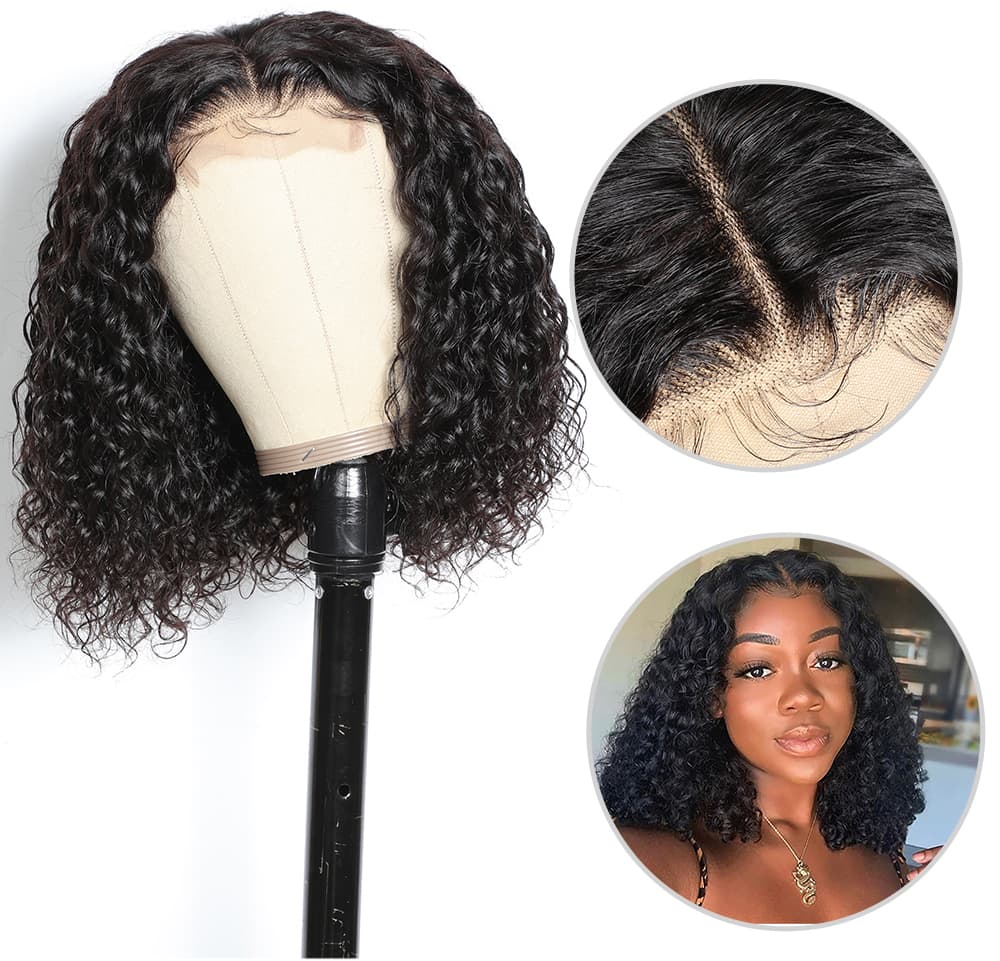 Incolorwig Short Bob Premium Water Wave 4x4 Lace Closure Wigs 150% Density Black Hair Wig
