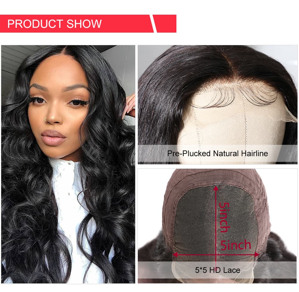 Incolorwig 5x5 HD Lace CLosure Wig Human Hair Body Wave Natural Black Lace Closure Wig